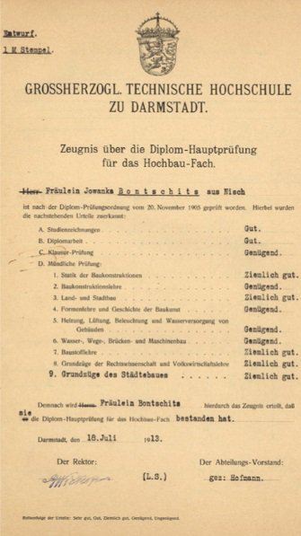 Studije je nastavila na Visokoj tehničkoj školi u nemačkom gradu Darmštat. Diplomirala je 18. jula 1913. godine kao prva žena u nemačkoj istoriji sa diplomom inženjera. Koliko je ovaj događaj bio značajan, svedoči tadašnje izdanje Berlinskog ilustrovanog lista (Berliner Illustrirte Zeitung) koji je na naslovnoj strani doneo fotografiju diplomaca na kojoj Jovanka sedi u prvom redu sa buketom cveća.