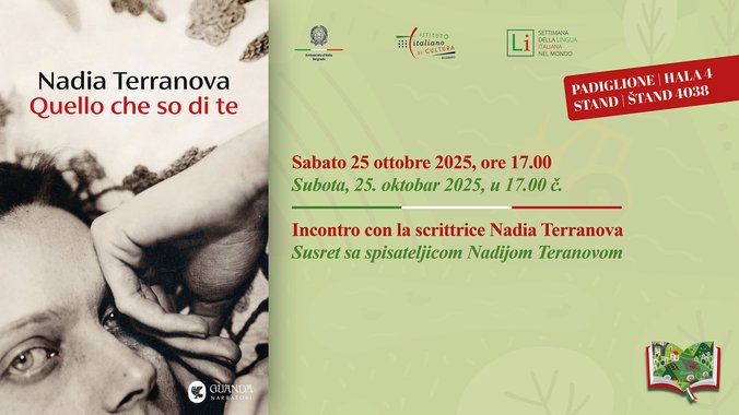 U subotu, 25. oktobra 2025. godine, počeće 68. izdanje Međunarodnog beogradskog sajma knjiga (25.10 – 02.11.2025). Italijanski institut za kulturu u Beogradu imaće čast da otvori svoj štand u prisustvu Nadije Teranove, jedne od najuvaženijih spisateljica italijanske književne scene. Ovaj događaj održaće se u Hali br. 4, na štandu Italijanskog instituta za kulturu u Beogradu (br. 4046) u 17.00 časova, uz konsekutivno prevođenje. Autorka će razgovarati sa direktorom Italijanskog instituta za kulturu u Beogradu Robertom Činkotom.