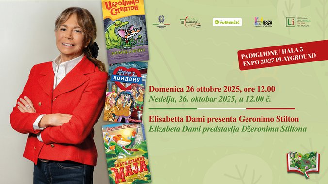 U nedelju, 26. oktobra 2025. godine u 12.00 časova u prostoru Expo 2027 Playground Italijanski institut za kulturu u Beogradu i Vulkan izdavaštvo predstaviće Elizabetu Dami, autorku Džeronima Stiltona, lika o kom maštaju milioni dece. Ovaj miš novinar sa živom radoznalošću i avanturističkim duhom izazvao je simpatije širom sveta. Knjige o njemu u Italiji objavljuje izdavačka kuća Piemme, a prevedene su na više od 50 jezika i distribuirane u preko 130 zemalja. Obuhvataju teme od istorije, geografije, mitologije, praistorije pa sve do trilera i klasične književnosti prilagođene deci. U Srbiji Stiltonove knjige objavljuje Vulkan izdavaštvo.