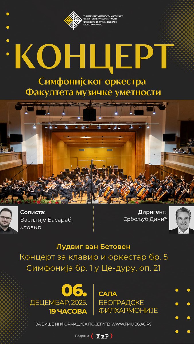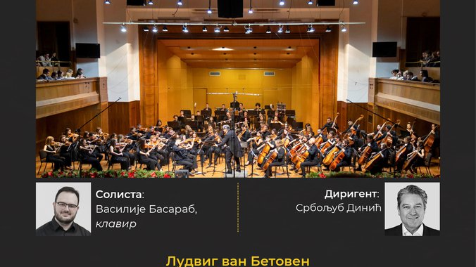 U subotu, 6. decembra u 19 časova, u svečanoj sali Beogradske filharmonije, biće održan koncert Simfonijskog orkestra Fakulteta muzičke umetnosti u Beogradu, pod upravom dirigenta maestra Srboljuba Dinića, uz solistički nastup mladog pijaniste Vasilija Basaraba. Na programu su remek-dela Ludviga van Betovena: Koncert za klavir i orkestar br. 5 u Es-duru („Carski“) i Simfonija br. 1 u Ce-duru, op. 21. 🎼