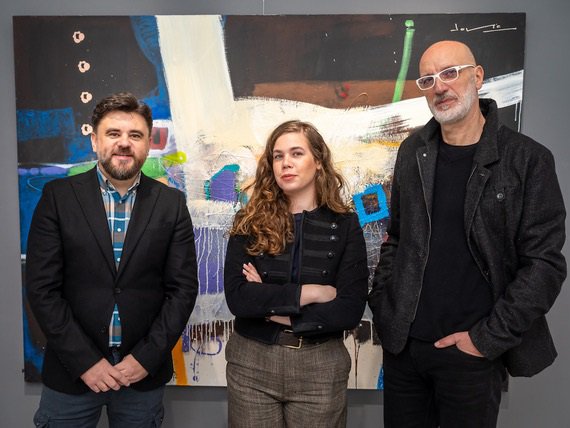 Posebno mesto na izložbi zauzima triptih Čuvari znanja, koji označava novu liniju Jovićevog umetničkog razvoja. Rasipanje sivih tonova, prisustvo ugljenisanih senki i iznenadan prodor plave boje naglašavaju autorovu sposobnost da gradi sopstveni tihi haos — prostor sudara modernističkih konstruktivističkih principa i savremenog poimanja post-subjekta. Vertikalni prodor plave u horizontalno zasnovanu kompoziciju postaje simbol unutrašnjeg proboja i potvrđuje autonomiju Jovićevog umetničkog jezika. 🧐