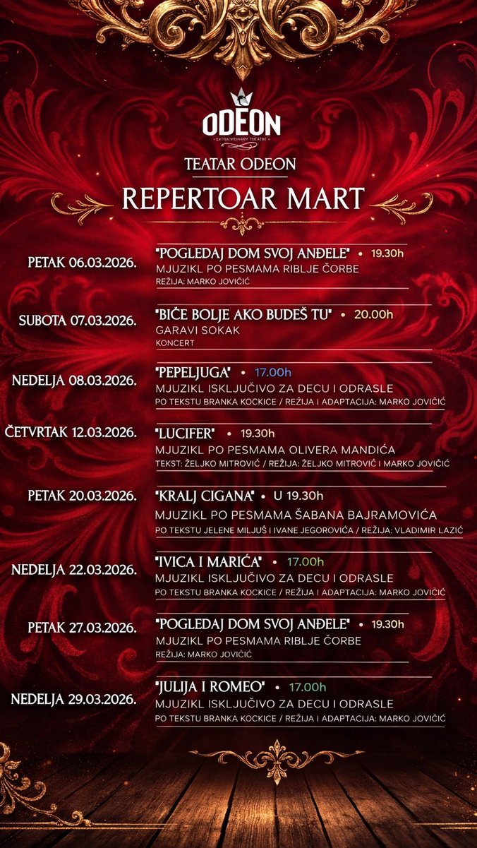Teatar Odeon nije zaboravio ni najmlađu publiku. Predstave Ivica i Marica i mjuzikl Pepeljuga donose bajkovitu scensku čaroliju, raskošne kostime i razigranu koreografiju.