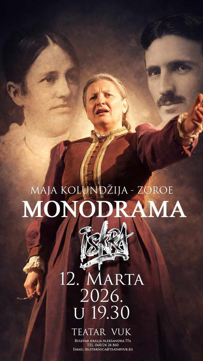 Monodrama Iskra, posvećena životu i delu jednog od najvećih umova u istoriji čovečanstva, Nikole Tesle, biće izvedena 12. marta od 19.30 časova u Teatru Vuk u Beogradu.