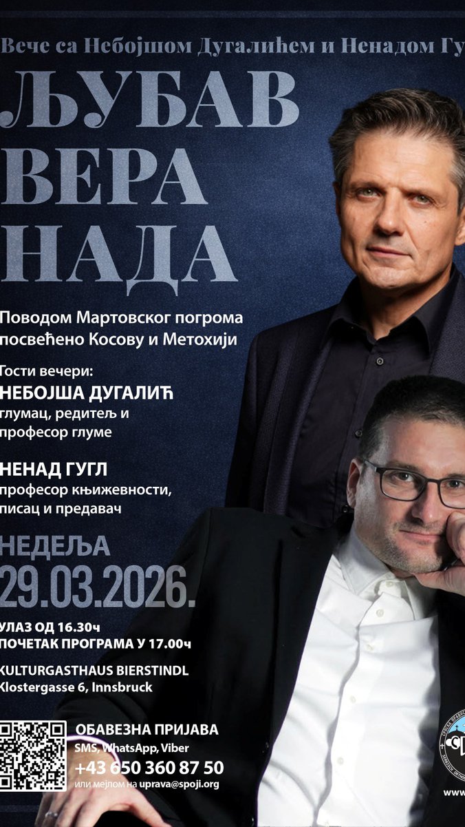 Povodom godišnjice Martovskog pogroma srpskog naroda sa Kosova i Metohije, Srpska pravoslavna omladina Inzbruka (SPOJI) organizuje predavanje sa dva posebna gosta.