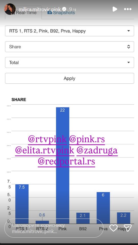 Kao što se može videti na grafikonu, koji je okačila ponosna direktorka programa televizije Pink Milica Mitrović, televizija Pink je daleko nadmašila sve druge konkurentske televizije, a sigurni smo da će to svojim uvek inovativnim programom nastaviti da čini i u budućnosti! 💗