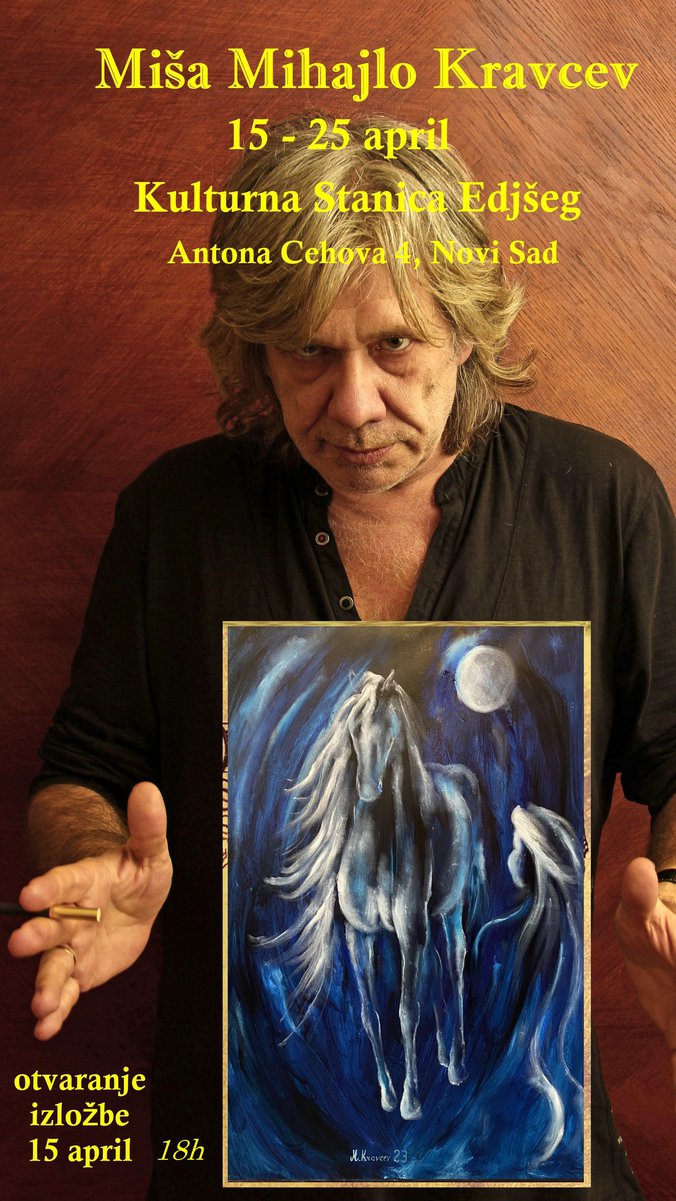 Poznati slikar i književnik, Miša Mihajlo Kravcev, izlagaće u Novom Sadu u atraktivnom i jedinstvenom, dvorskom ambijentu Kulturne Stanice Eđšeg, Antona Čehova 4. 🖼️