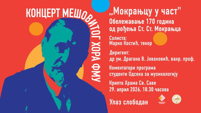 Pod upravom dirigenta dr um. Dragane V. Jovanović, vanr. prof, uz asistenta dirigenta Teodoru Toković, saradnika u nastavi, hor će izvesti program posvećen jednom od najznačajnijih srpskih kompozitora – Stevanu Stojanoviću Mokranjcu, povodom 170 godina od njegovog rođenja. Kao solista nastupiće Marko Kostić, tenor, dok su komentatori programa studenti Odseka za muzikologiju. 😍