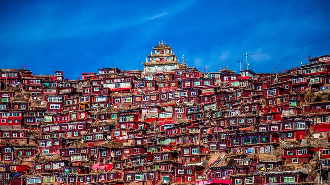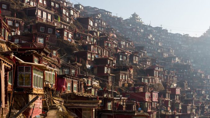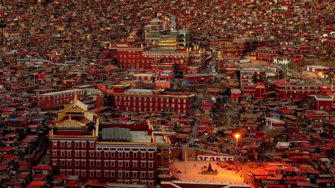 Čak i za sekularne turiste, prvi pogled na Larung Gar je nezaboravan: desetine hiljada sićušnih crvenih kućica raširiće se na brdima oko centralnih molitvenih sala je poput duhovnog bedema koji blista na jarkom, žestokom suncu tibetanske visoravni. Tanak vazduh dodaje onostrani osećaj mesta. Smešten na oko 4.000 metara nadmorske visine, svaki korak ovde predstavlja napor, a šetnja od glavne kapije kroz kompleks do hotela na vrhu jednog od brda deluje sama po sebi kao hodočašće.