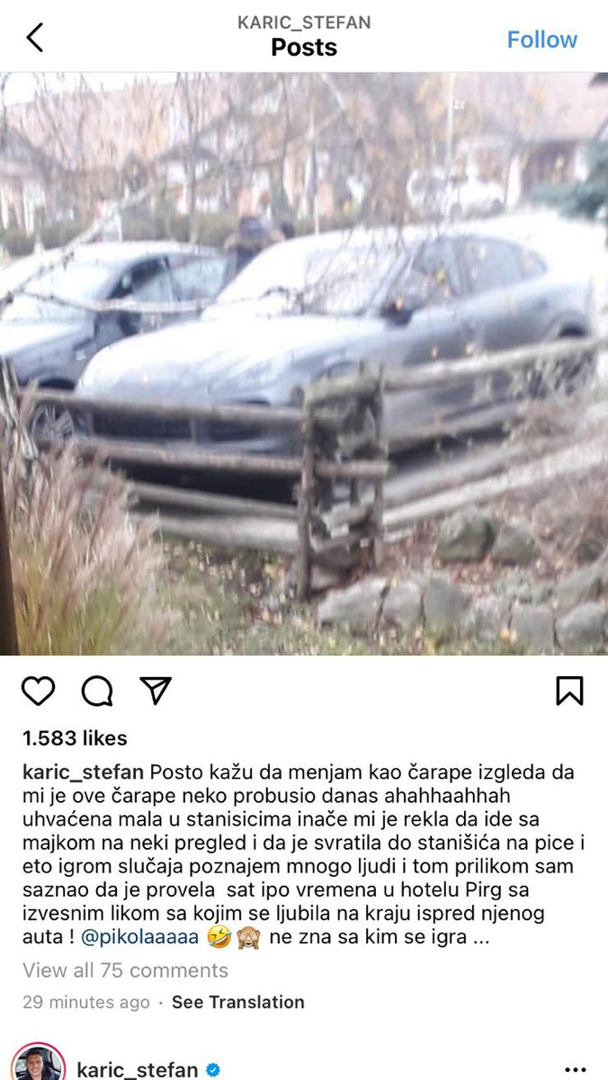 - Pošto kažu da menjam kao čarape, izgleda da mi je neko ove čarape probušio danas. Ahahahaha uhvaćena mala u Stanišićima. Inače mi je rekla da ide sa majkom na neki pregled i da je svratila do Stanišića na piće. I eto, igrom slučaja poznajem mnogo ljudi i tom prilikom sam saznao da je provela sat i po vremena u hotelu Pirg sa izvesnim likom sa kojim se posle ljubila ispred njenog auta. Ne zna sa kim se igra - napisano je u opisu mutne fotografije.