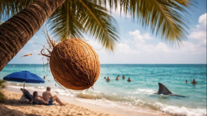 U tropskim krajevima, gde kokosove palme rastu u blizini plaža, kuća i pešačkih zona, teški plodovi koji padaju sa visine od 10 i više metara mogu izazvati ozbiljne, pa i smrtonosne povrede. Procene govore o nekoliko desetina smrtnih slučajeva godišnje širom sveta 😐, dok su smrtonosni napadi ajkula izuzetno retki i najčešće se broje na prste jedne ruke.