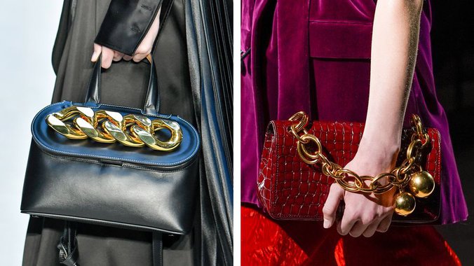 Ove jeseni naručito će biti popularni modeli torbi koje krase glomazni lanci. Bilo da je od njih načinjena ručka same torbe ili su pridodati samo kao ukras izgledaće fantastično. Takođe, ukoliko ponesete ovakvu torbu budite obazrivi prilikom biranja odevne kombinacije, odnosno neka torba bude u prvom planu, dok odeća treba da ostane svedenija i bez šarenila.