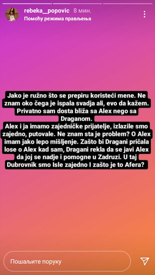 - Jako je ružno što se prepiru koristeći mene. Ne znam oko čega je ispala svađa, ali evo da kažem. Privatno sam dosta bliža sa Aleks nego sa Draganom. Aleks i ja imamo zajedničke prijatelje, izlazile smo zajedno, putovale. Ne znam šta je problem? O Aleks imam jako lepo mišljenje. Zašto bi Dragana pričala loše o Aleks kad sam Dragani rekla da se javi Aleks da joj se nađe i pomogne u Zadruzi. U taj Dubrovnik smo zajedno išle i zašto je to afera? - poručila je Rebeka na svom profilu na Instagramu.