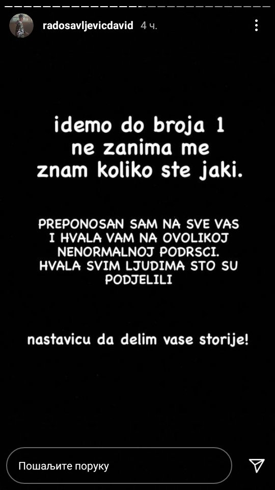 Idemo do broja 1. Ne zanima me, znam koliko ste jaki. Preponosan sam na sve vas i hvala vam na ovolikoj nenormalnoj podršci. Hvala svim ljudima što su podelili - poručio je David u novoj objavi.
