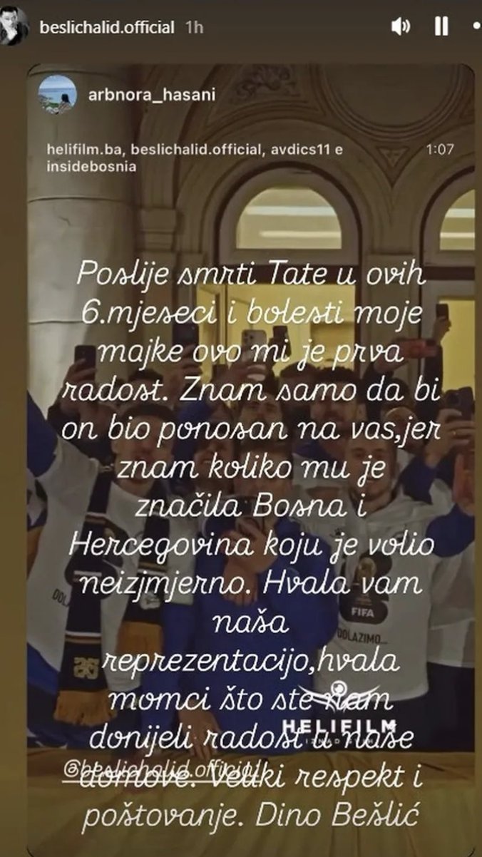- Posle smrti tate u ovih 6 meseci i bolesti moje majke, ovo mi je prva radost. Znam samo da bi on bio ponosan na vas, jer znam koliko mu je značila Bosna i Hercegovina koju je voleo neizmerno. Hvala vam, naša reprezentacijo, hvala momci, što ste nam doneli radost. Globalno veliki respekt i poštovanje. Dino Bešlić - napisao je on.