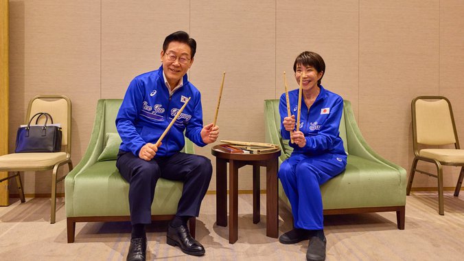 Tokom zvanične posete Japanu, dvoje lidera su, obučeni u usklađene plave jakne, zajedno svirali bubnjeve uz hitove K-popa, među kojima je bila i pesma Dynamite grupe BTS. Ovaj neformalni nastup organizovan je kao završni događaj posete, ali i kao omaž Takaičinoj mladosti, budući da je nekada bila bubnjarka u hevi-metal bendu.