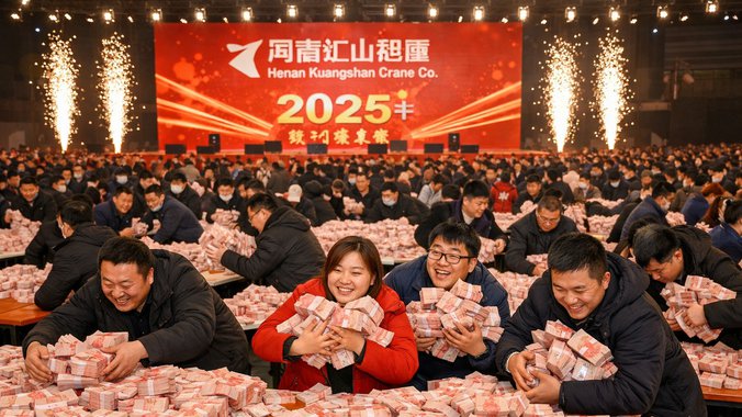 During a Chinese New Year celebration, Henan Kuangshan Crane piled up mountains of cash for 7,000 employees.