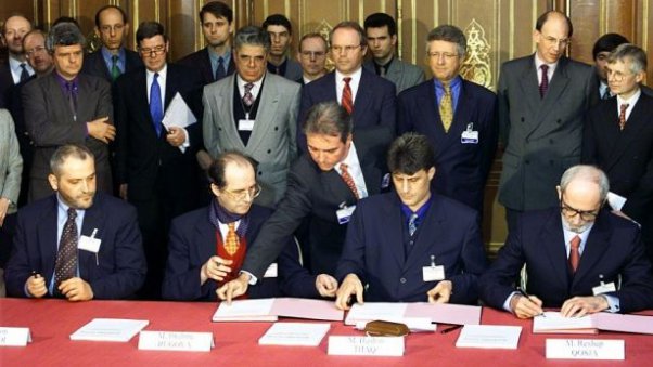 Delegacija Albanaca sa Kosova i Metohije potpisala je sporazum koji su ponudili međunarodni pregovarači, dok je državna delegacija Srbije potpisala sopstveni predlog političkog sporazuma - Sporazum o samoupravi na Kosovu i Metohiji.