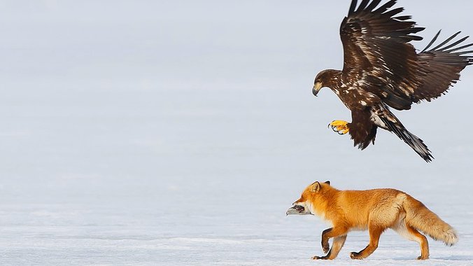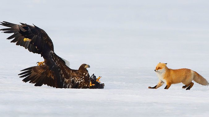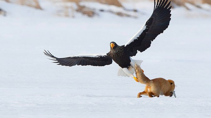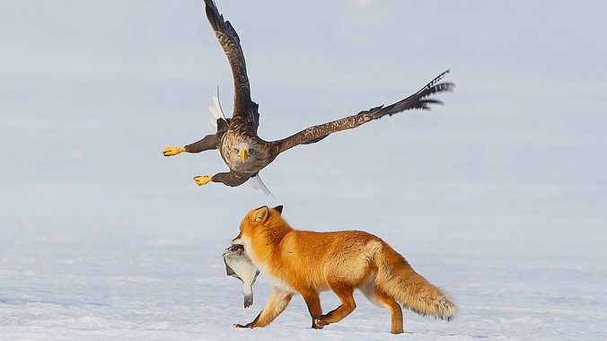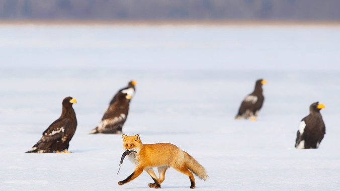 Krznena crvena lisica uspela je da pobegne sa ribom u ustima, bežeći od džinovskih Stelerovih morskih orlova na zaleđenom jezeru u blizini Hokaida u Japanu.