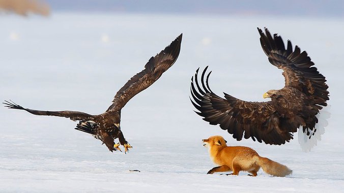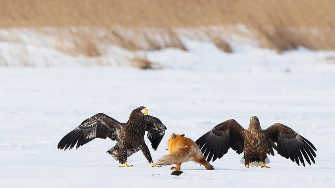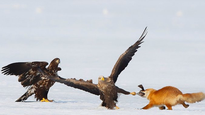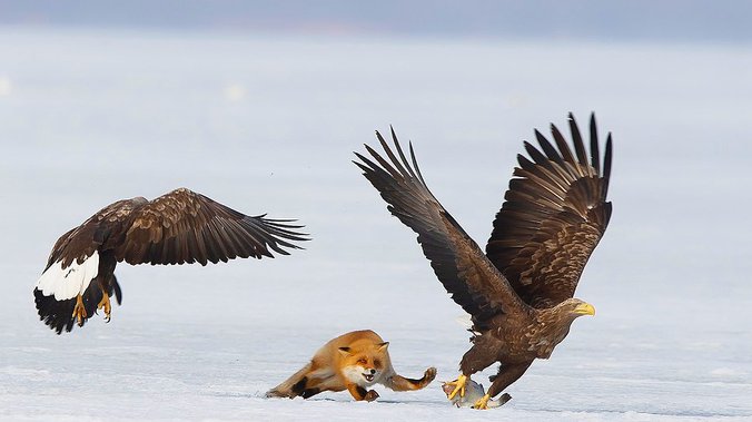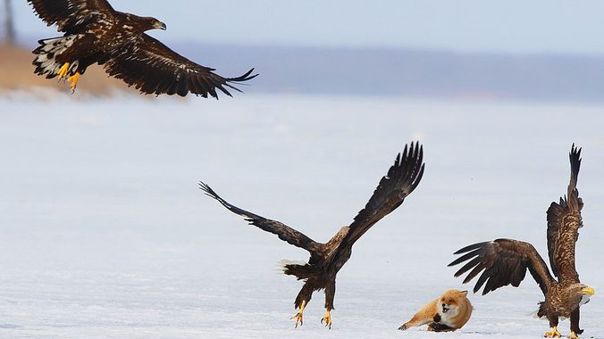 Slike na kojima grupa morskih orlova napada lisicu, pokušavajući da "otme" hranu, uslikao je fotograf iz Japana.