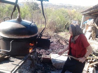 Kazan se, po starom običaju, spušta u donje dvorište, mesto zaklonjeno od vetra, blizu šljivaka. Tu se polako širi gust miris komine, mešajući se sa dimom što se izvija u plavičastim trakama ka nebu. Iz štale se čuju ovce i koke, dodajući tom prizoru živu, gotovo muzičku pozadinu. Deda od ranog jutra loži vatru ispod kazana, pažljivo dodajući cepanice da plamen bude ni prevelik ni preslab. U ruci drži staru kašiku kojom povremeno proba prve kapi što poteku iz lule. Pored njega baba pazi da se ništa ne pregori i ujedno sprema ručak za sve koji pomažu. Deca trčkaraju okolo, igraju žmurke i skupljaju opalo lišće, dok miris kuvane šljive i dima ispunjava vazduh. U tom trenutku vreme kao da stane i sve deluje mirno, skladno i toplo.
