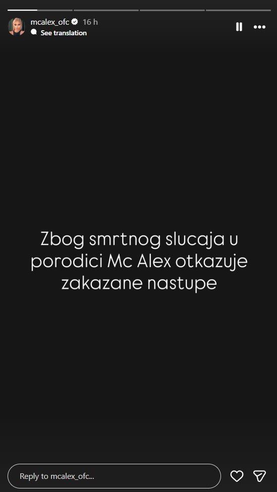 - Mc Alex je umro otac, nastupi se otkazuju do daljnjeg. Javiće se pojedinačno svima kada bude u stanju. Molimo vas da razumete.