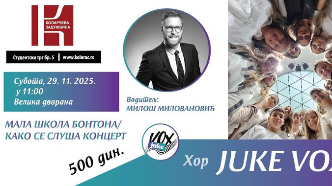 U nastavku dečjeg programa Mala škola bontona/Kako se sluša koncert, na Kolarcu nas u subotu 29. novembra od 11 časova očekuje tinejdž hor JukeVox.
