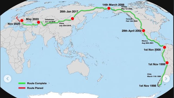 On je davne 1998. krenuo iz Punte u Čileu, a očekivao je da će ovaj njegov poduhvat trajati oko 12 godina. Ovaj put je dugačak neverovatnih 50.000 kilometara.