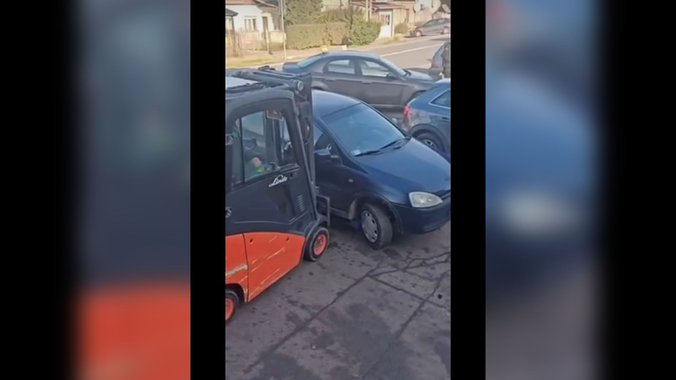 Kako se na snimku sa društvenih mreža može videti muškarac koji je vozio viljuškar uspeo je da pomeri vozilo i da omogući drugom vozilu da se isparkira.