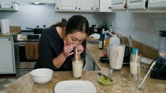 Nakon što napravi „šejk“ od ručka, ona postavi slamčicu u nos i usisa ceo obrok direktno u nazalne puteve.