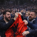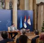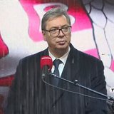 Za kraj protesta, okupljeni izvode najavljeni "performans" - gađaju jajima kartonski transparent, na kom je nacrtan predsednik Republike Srbije.