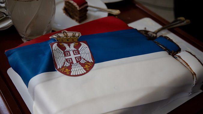 Selektor Srbije Uroš Stevanović i kapiten reprezentacije Nikola Jakšić svečano su isekli tortu sa zastavom Srbije.