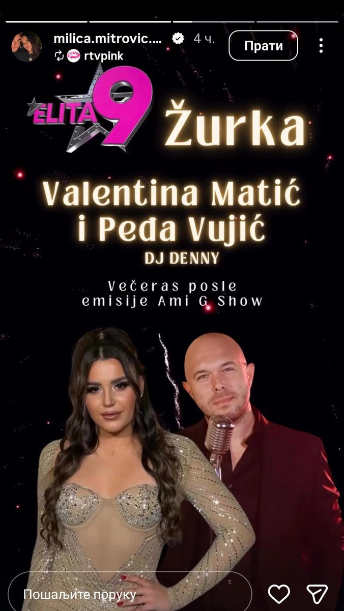 Svakog utorka nakon emisije Amidži šou sledi velika žurka u Eliti 9 u kojoj gostuju najpopularniji klupski pevači, a to su Valentina Matić i Peđa Vujić. 🥳