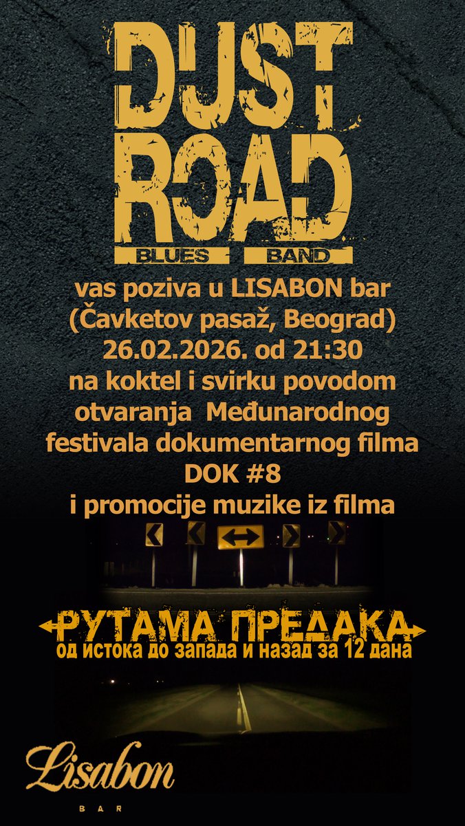 Dana 26.02.2026. godine, u prostorijama LISABON bara (Čavketov pasaž kod MTS Dvorane, Beograd) sa početkom u 21.30 časova, održaće se koktel party i svirka benda Dust Road bb povodom otvaranja Međunarodnog festivala dokumentarnog filma DOK #8 i promocije muzike iz putopisnog dokumentarnog filma reditelja Marka Kovača Rutama predaka - od istoka do zapada i nazad za 12 dana koji će biti premijerno prikazan na festivalu sutradan 27.02.2026. u sali 5 MTS Dvorane (bivši Dom sindikata) od 18.30 časova.