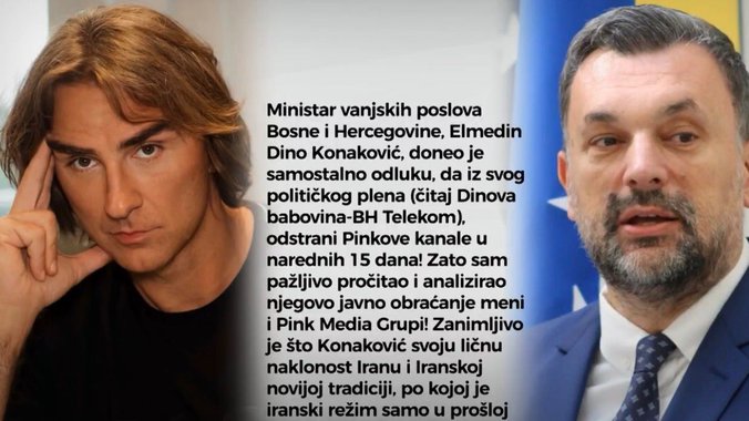 - Ministar vanjskih poslova Bosne i Hercegovine, Elmedin Dino Konaković, doneo je samostalno odluku, da iz svog političkog plena (čitaj Dinova babovina-BH Telekom), odstrani Pinkove kanale u narednih 15 dana! Zato sam pažljivo pročitao i analizirao njegovo javno obraćanje meni i Pink Media Grupi!