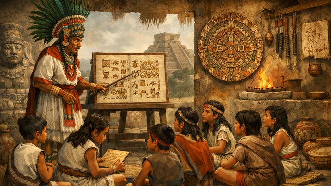 U drevnom Aztečkom carstvu, obrazovanje nije bilo privilegija već obaveza za svu decu, bez obzira na pol, društveni status ili poreklo. Azteci su među prvima u svetu uveli sistematsko školovanje koje je bilo besplatno i dostupno svima. Deca su od najranijih godina učila osnovne veštine kod kuće, a zatim su pohađala škole koje su bile prilagođene njihovom društvenom sloju.