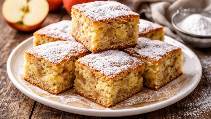 Jabuke oljuštite i iseckajte na tanke kockice, pa ih umešajte u testo zajedno sa malo cimeta. 🍏 Smesu sipajte u podmazan pleh i pecite u prethodno zagrejanoj rerni na 180°C oko 30–35 minuta, dok kolač ne dobije zlatnu boju. 🥮