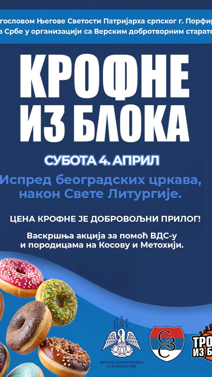 Humanitarna organizacija Srbi za Srbe, u saradnji sa Verskim dobrotvornim starateljstvom Arhiepiskopije beogradsko-karlovačke, sa blagoslovom Njegove Svetosti Patrijarha srpskog gospodina Porfirija, organizuje u subotu, 4. aprila 2026. godine, na Lazarevu subotu, veliku Vaskršnju humanitarnu akciju pod nazivom Krofne iz bloka. ❤️