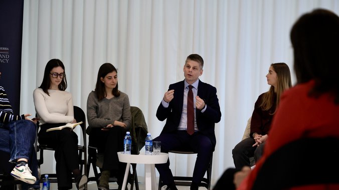 Direktor Kancelarije za javnu i kulturnu diplomatiju Arno Gujon razgovarao je danas u Beogradu sa studentima master studija prestižnog francuskog Univerziteta Sorbona iz Pariza, koji u Srbiji borave u okviru studijskog putovanja posvećenog temi: "Nasleđe, pamćenje, identitet".