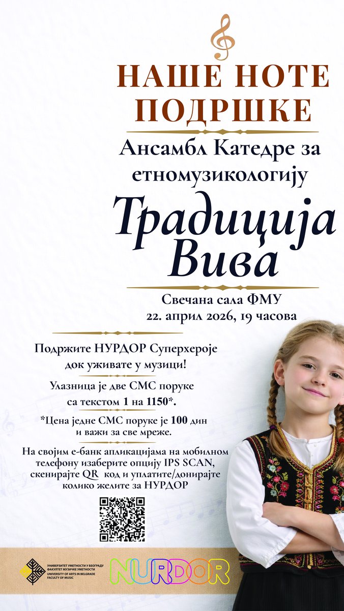 Ansambl „Tradicija viva“, koji čine studenti Katedre za etnomuzikologiju Fakulteta muzičke umetnosti u Beogradu, pod umetničkim rukovodstvom prof. dr Sanje Ranković, nastupiće 22. aprila u 19 časova u Svečanoj sali FMU, u okviru humanitarnog ciklusa „Naše note podrške“.