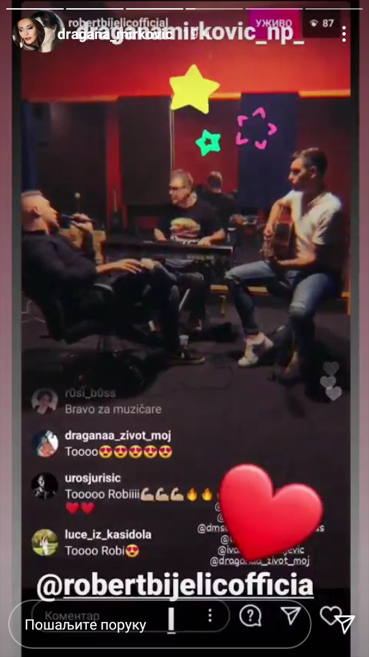 Mladi folk pevač Robert Bijelić je pevao svojim pratiocima na Instagramu. Među pesmama koje je otpevao u studiju, bio je i veliki hit folk dive Dragane Mirković Nisam ni metar od tebe. Jednu od najvećih muzičkih zvezda na ovim prostorima je Robijev gest oduševio i ona je to javno pokazala svojom objavom na Instagramu.